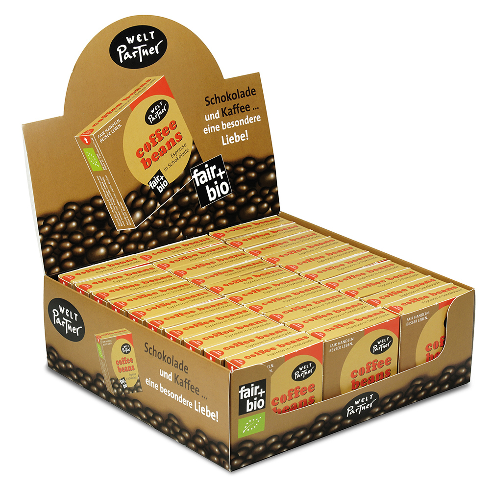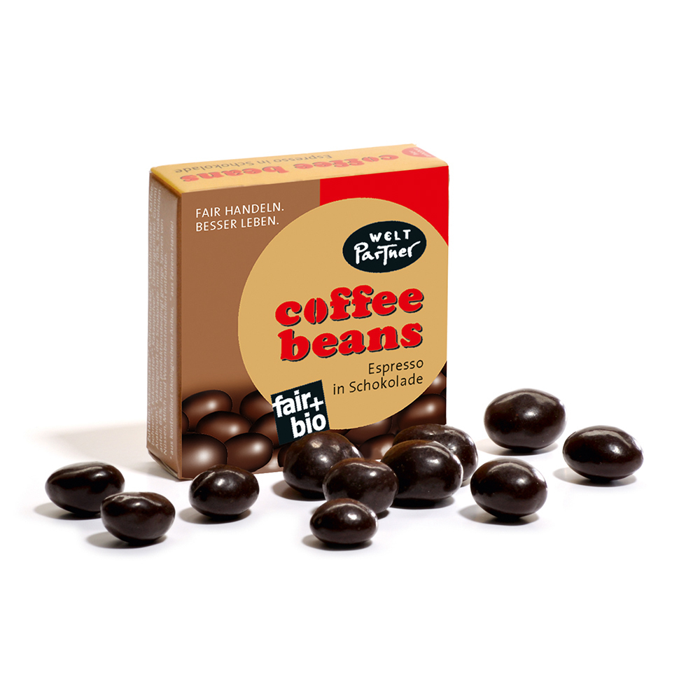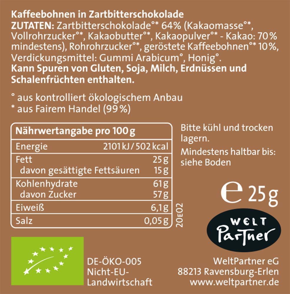 - Geröstete Bio-Arabica-Bohnen, umhüllt von feiner Zartbitterschokolade
