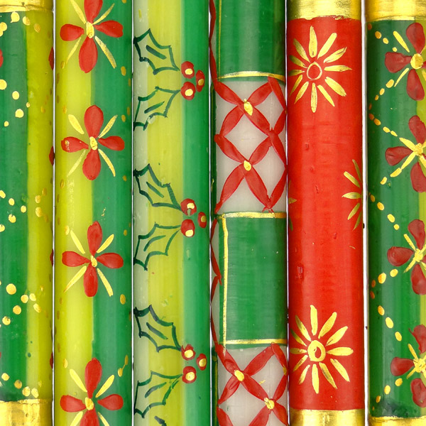 Fairtrade Künstlerkerze, Maß: 23cm, von Hand mit Wachs bemalt und in Folie verpackt. Material: hochwertiges Paraffinwachs, Brenndauer ca. 12 Stunden. Vielfältige Designs, gelieferte Artikel können von der Abbildung abweichen.