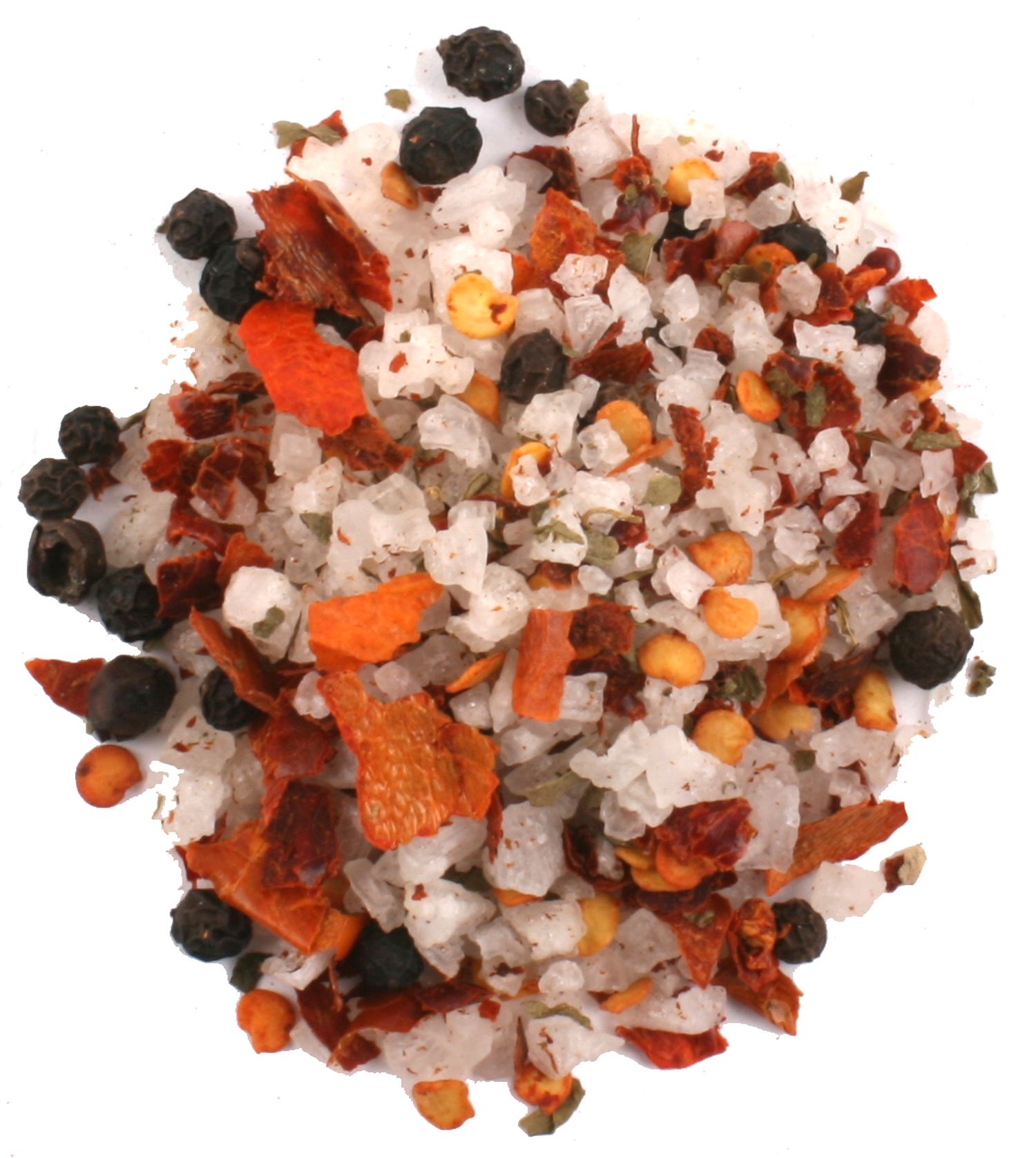 Dieses handgewonnene Meersalz erhält durch die Mischung mit Chiliflocken, Pfeffer und Petersilie einen Hauch von frischer Schärfe.
