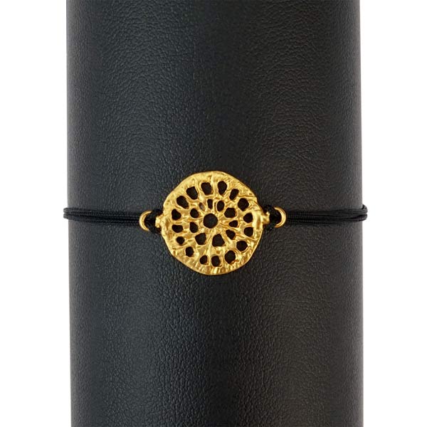 Mandala: "Das Mandala, der heilige Kreis, kann uns ein Wegweiser zu unserer eigenen Mitte sein. Dieses Armband soll dich an die Bedeutung spiritueller Ausgeglichenheit erinnern. Trage es mit Stolz und bleibe dir selbst treu." Material: 24 Karat vergoldet/Legierung ca. 5 Mikron. Durchmesser ca.8mm. Schwarzes Textilarmband, Umfang variabel bis 20cm.