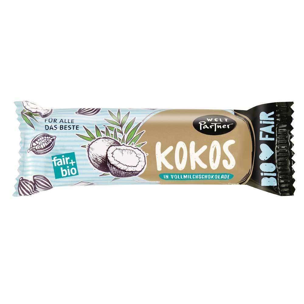Kokosraspeln 40%°*, Maissirup°, VollMILCHschokolade 22%°* (Rohrohrzucker, VollMILCHpulver, Kakaobutter, Kakaomasse, Vanille-Extrakt; Kakao: 37% mindestens), Reismilchpulver°