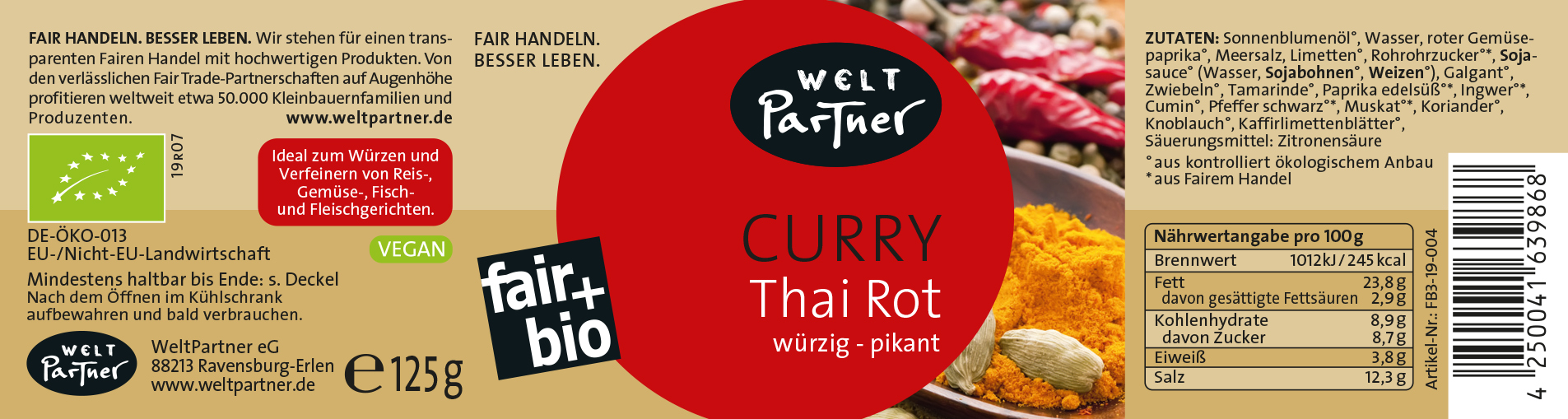 Sonnenblumenöl°, Wasser, roter Gemüsepaprika°, Meersalz, Limetten°, Rohrohrzucker°*, SOJAsauce° (Wasser, SOJABOHNEN°, WEIZEN°), Galgant°, Zwiebeln°, Tamarinde°, Paprika edelsüß°*, Ingwer°*, Cumin°, Pfeffer schwarz°*, Muskat°*, Koriander°, Knoblauch°, Kaffirlimettenblätter°, Säuerungsmittel: Zitronensäure