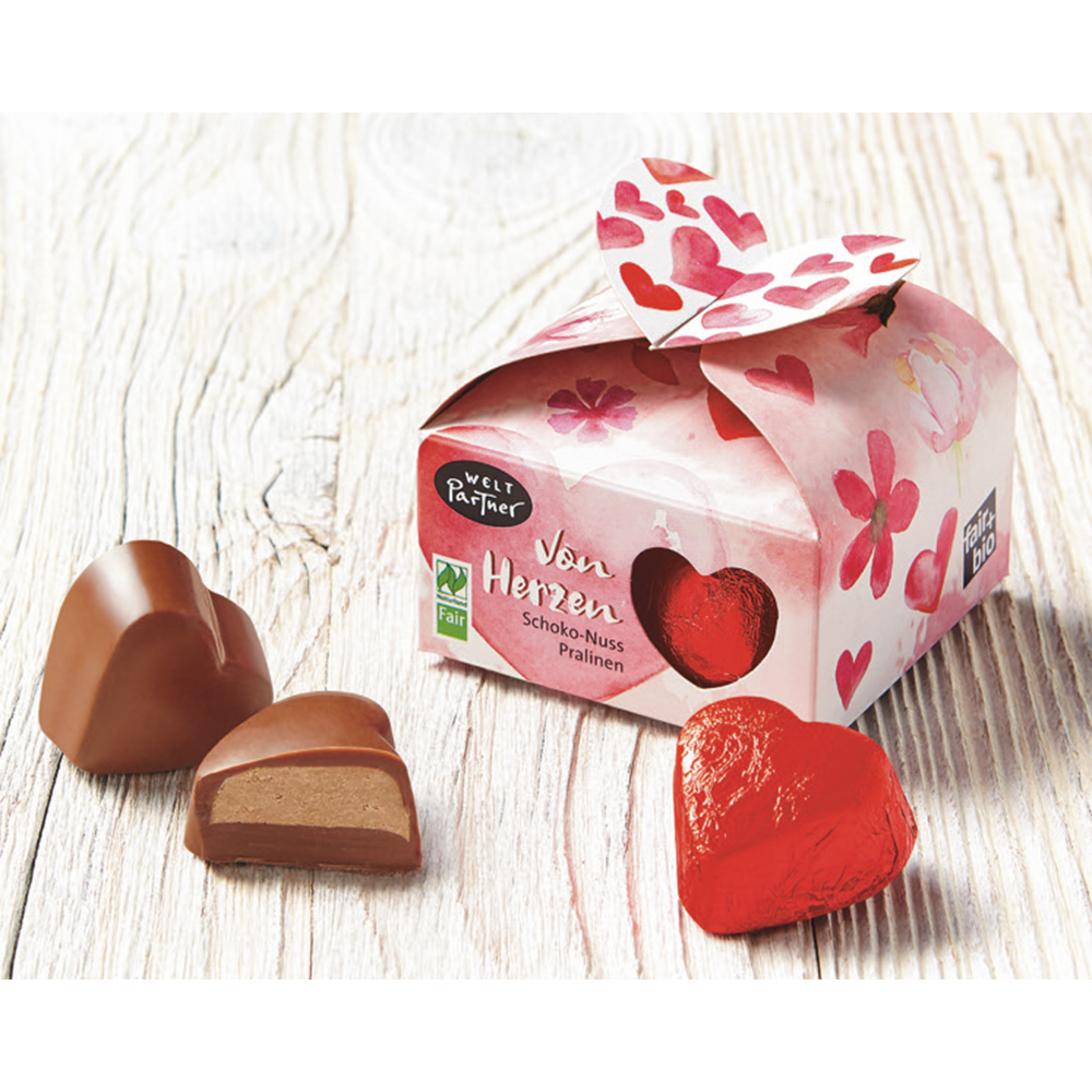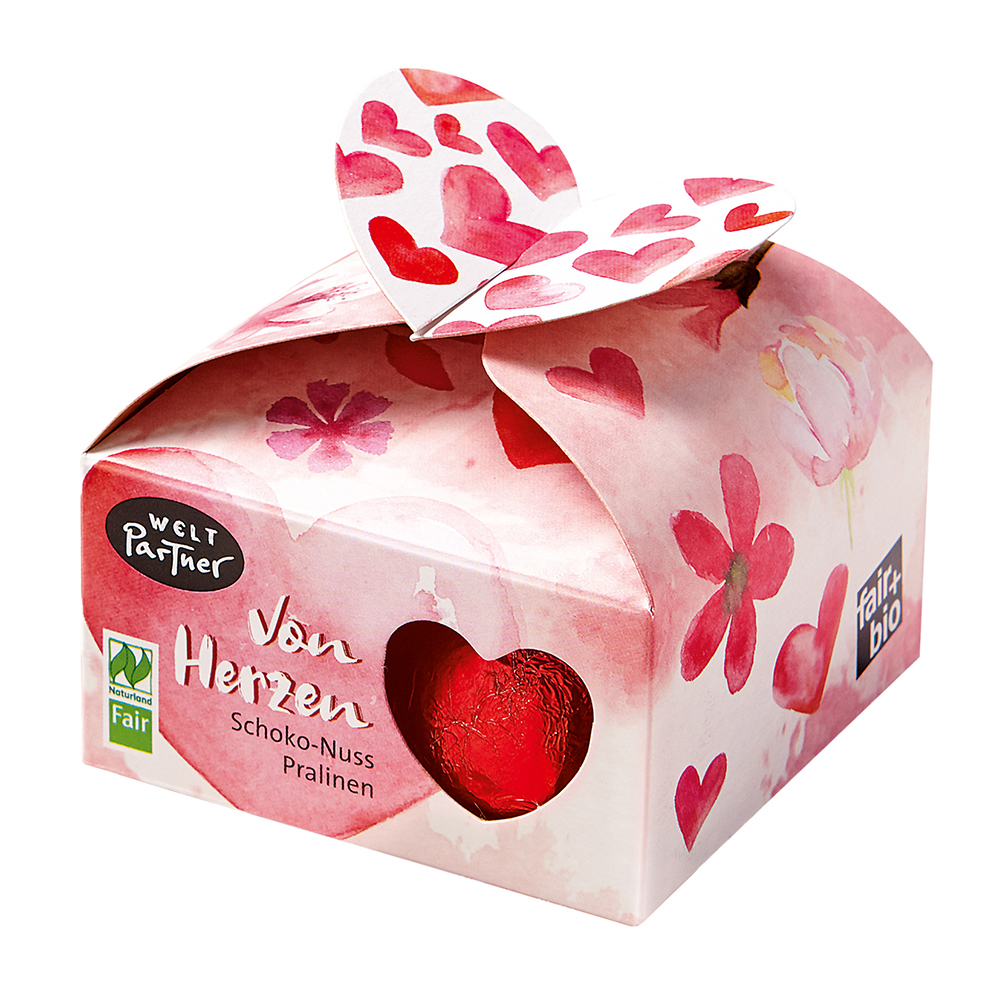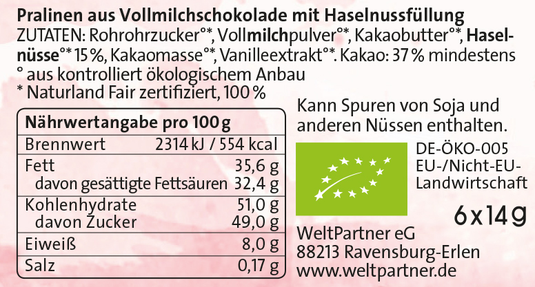 Köstliche handgemachte Pralinen mit Haselnuss-Füllung. Die Vollmilchschokolade ist durch die feine faire Milch unseres Partners Berchtesgadener Land wunderbar sahnig. Durch Rohrzucker von Manduvirá/Paraguay bekommt die Schokolade noch eine besondere Note. Die aromatischen Haselnuss-Stückchen werden von ISIK Tarim aus der Türkei geliefert.