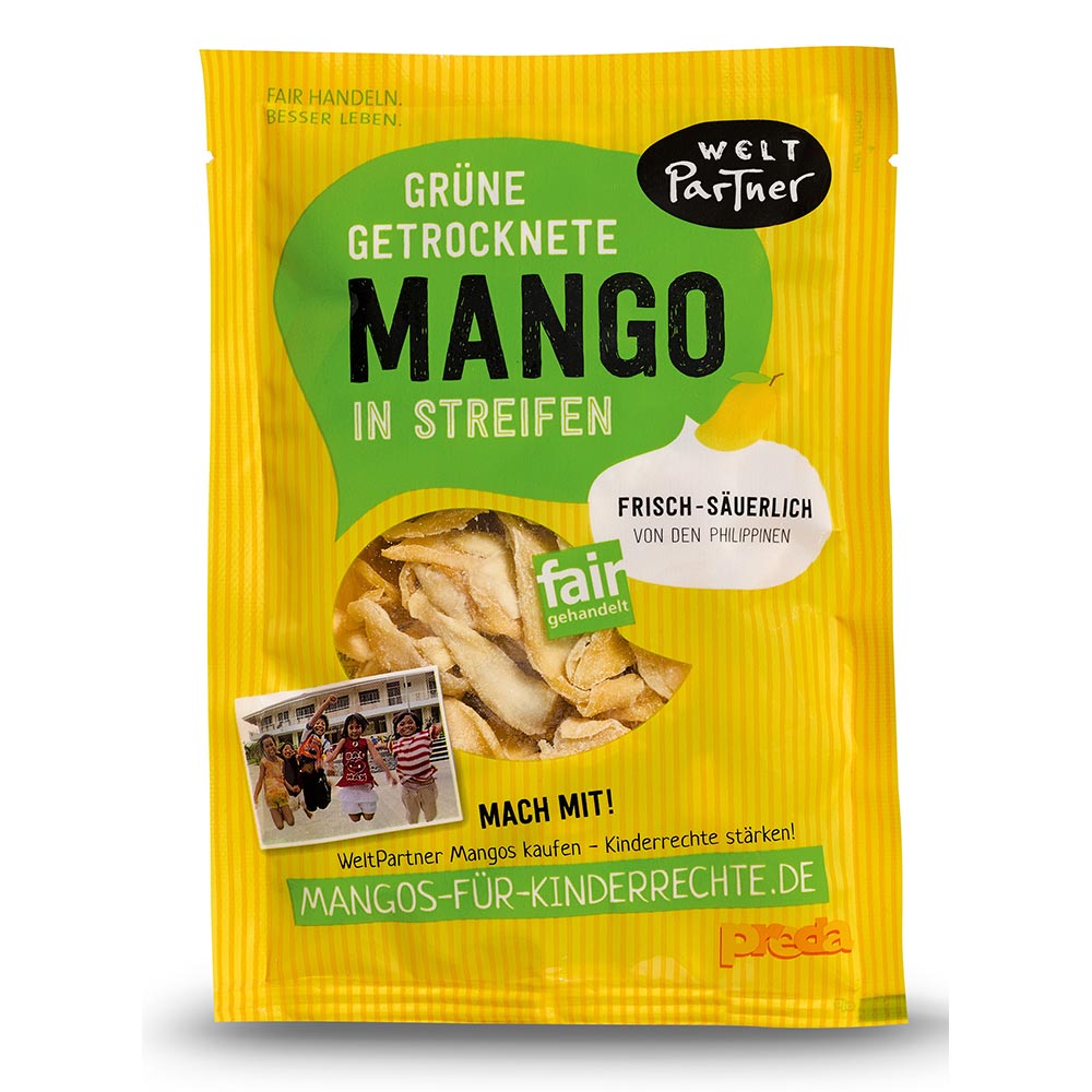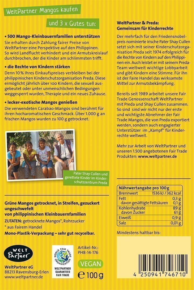 -Carabao-Mangos von philippinischen Kleinbauern. Einen Teil der Erlöse aus dem Fairen Handel verwendet PREDA als finanzielle Grundlage für ihre Sozialprogramme und Menschenrechtsarbeit.