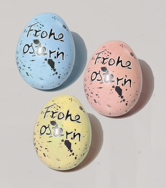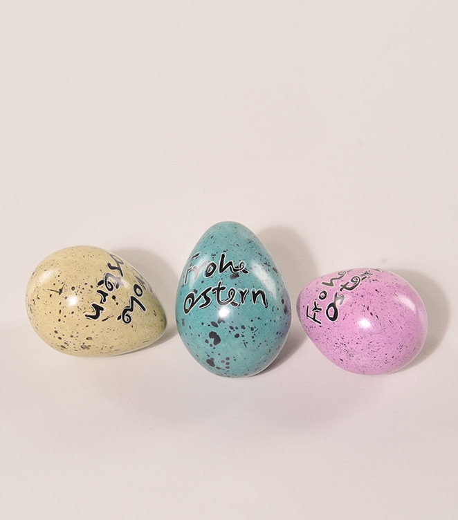 3 EIER Frohe Ostern M gelb, blau, rose