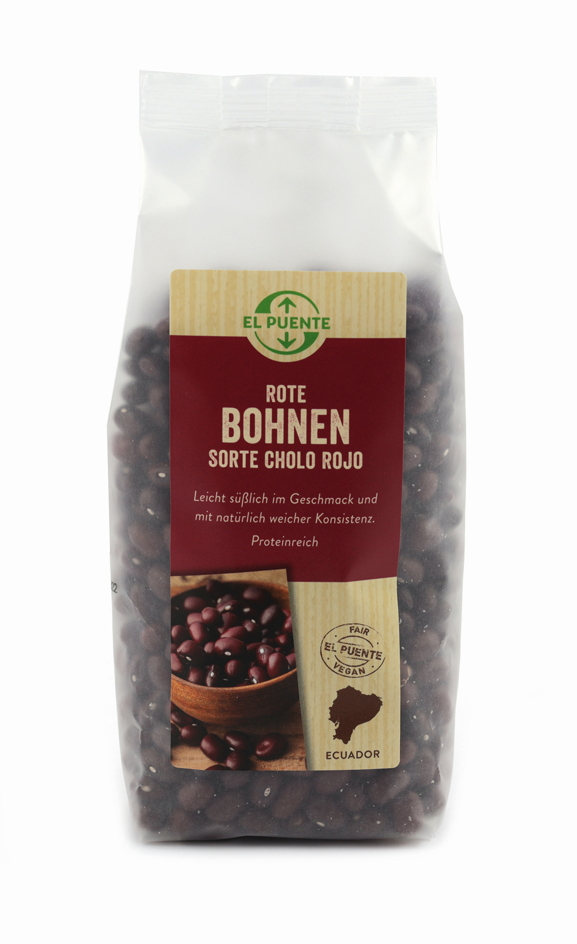 Rote Bohnen dürfen in der authentischen südamerikanischen Küche nicht fehlen. Unsere getrockneten Bohnen werden von Kleinbauern in Ecuador angebaut und weiterverarbeitet. Getrocknete Bohnen eignen sich für die Zubereitung von Eintöpfen und Salaten. Sie müssen vor dem Kochen möglichst über Nacht mit Wasser eingeweicht werden.