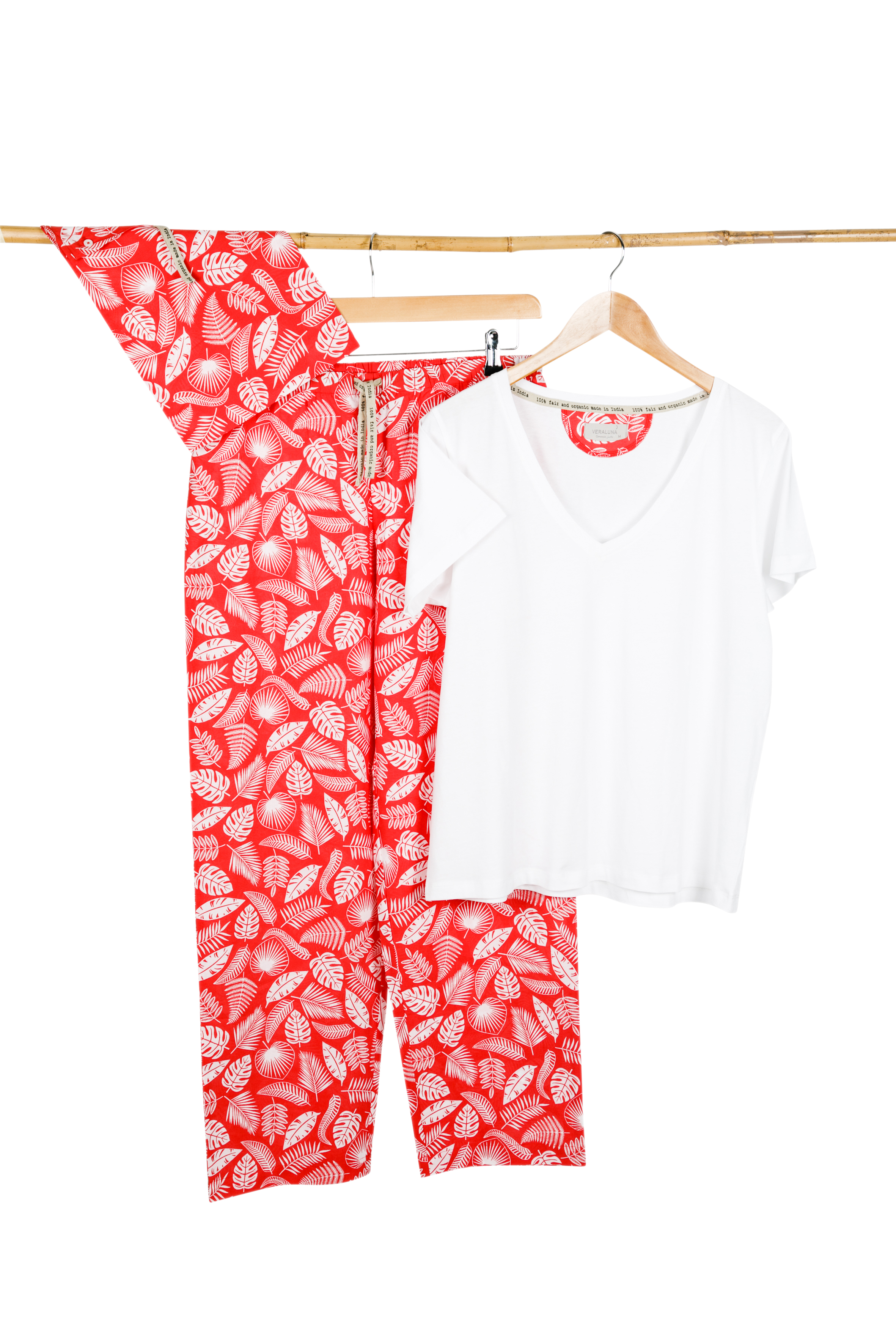 Das unifarbene Kurzarmshirt aus Single-Jersey hat einen V-Ausschnitt. Die lange Hose wurde aus feinem Voile mit großem Blattmotiv gefertigt und hat ein gerades Bein. Der Gummibund ist mit Stoff bezogen und hat ein zusätzliches Durchzugband. Der Pyjama ist in einem Stoffbeutel verpackt, den Sie später z.B. auf Reisen verwenden. Für den fairen Pyjama wird 100 % Bio-Baumwolle von unserem GOTS-zertifizierten Handelspartner Rajlakshmi verwendet.