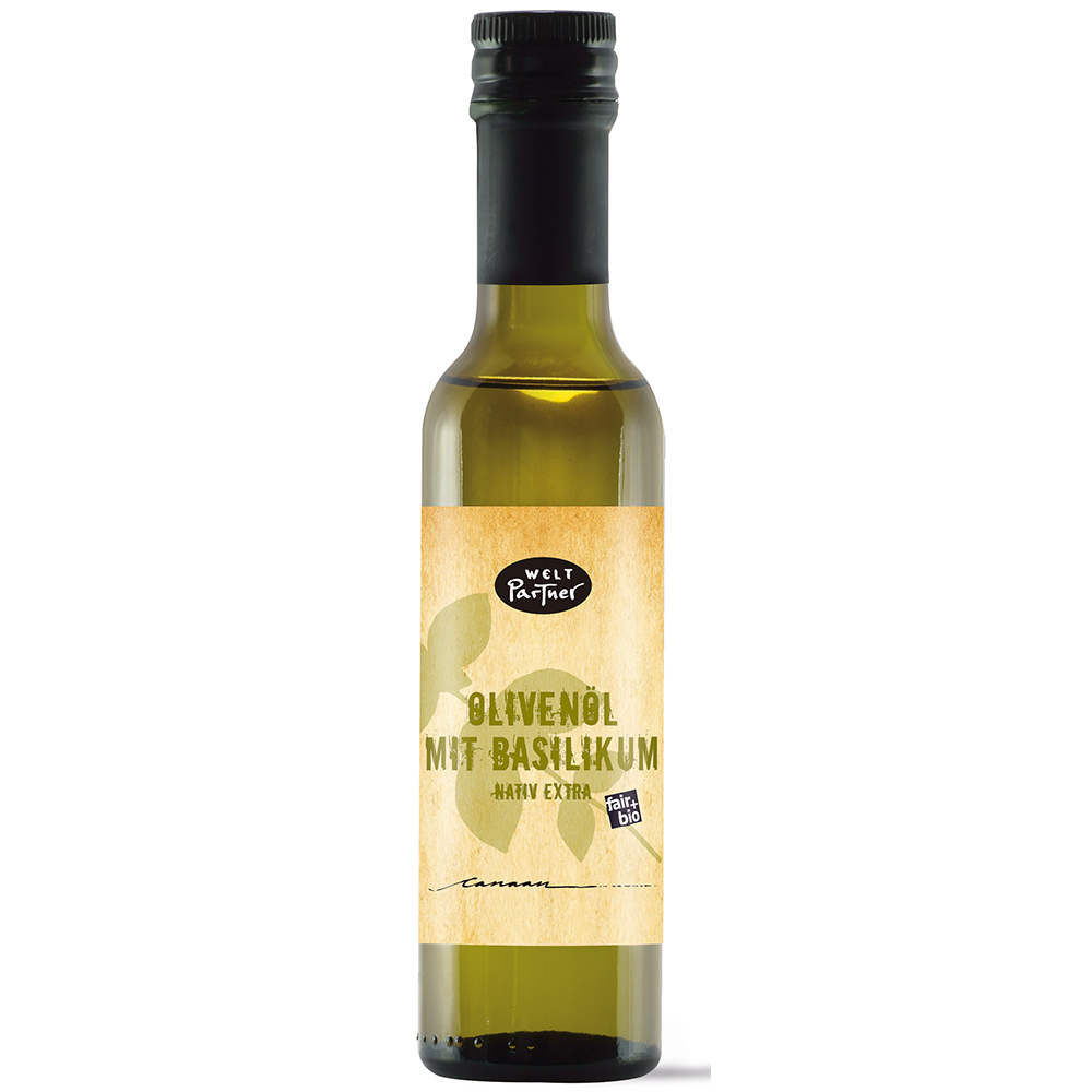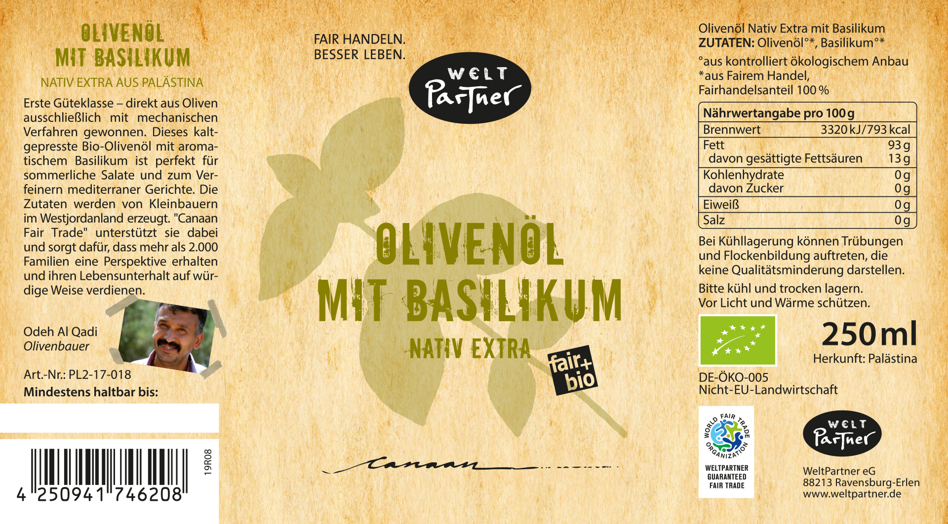 Eine ausgesuchte Spezialität ist dieses kaltgepresste Olivenöl - verfeinert mit aromatischem Basilikum. Die Zutaten werden von Kleinbauern im Westjordanland erzeugt.