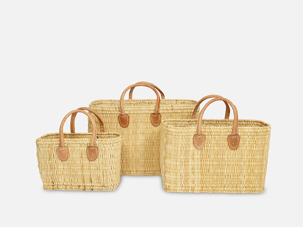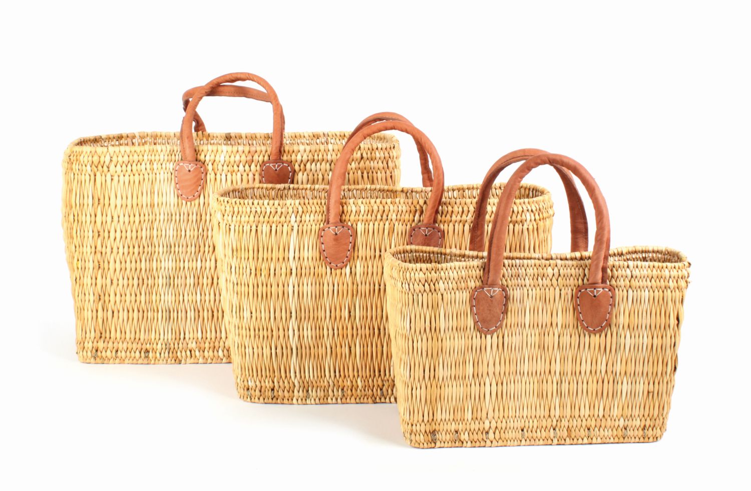 Schilfgras mit Ledergriffen, 45 x 17 x 32 cm, 35 x 15 x 25 cm, und 29 x 12 x 21 cm