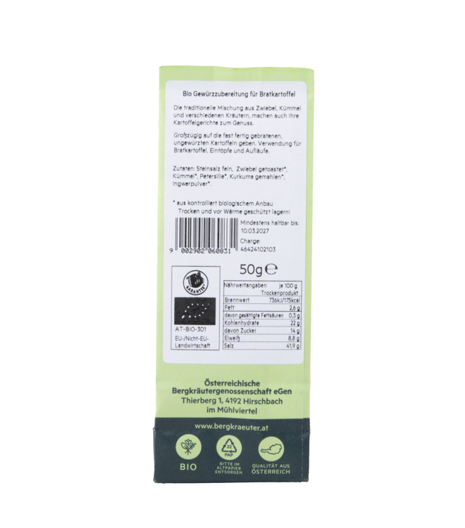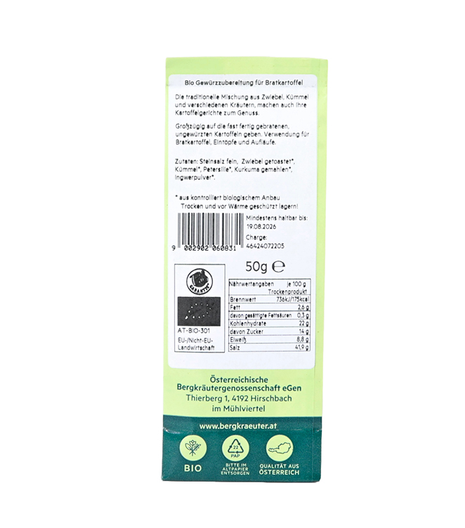 Die traditionelle Mischung aus Röstzwiebel, Kümmel und verschiedener Kräutern machen ihre Kartoffelgerichte zum Genuss! Zutaten: Röstzwiebel, Meersalz (jodiert), Petersilie, Kümmel, Kurkuma, Ingwerpulver.